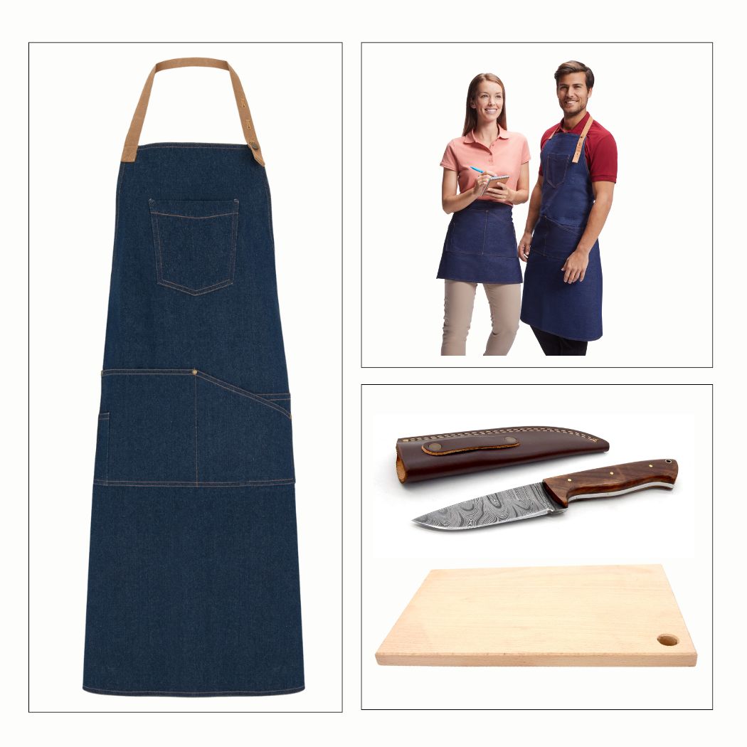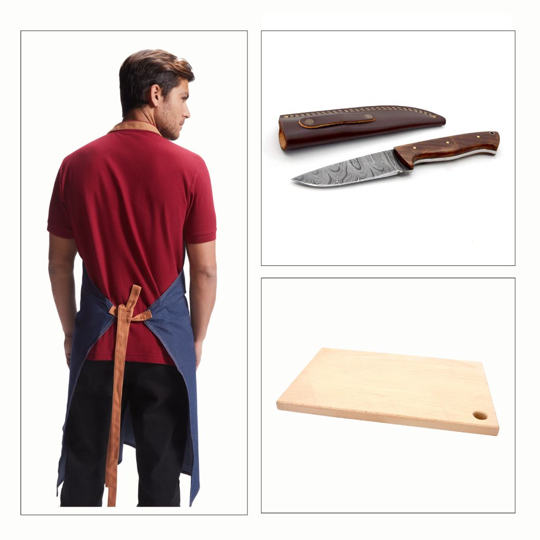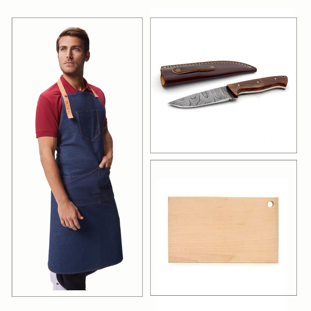 Damask lovački nož i pregača od trapera uz dasku za rezanje gratis.