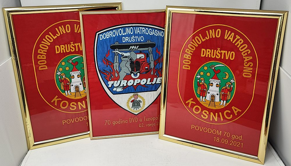 Plaketa sa vezenim logom u rami (okviru), sa otisnutim tekstom prema želji kupca.